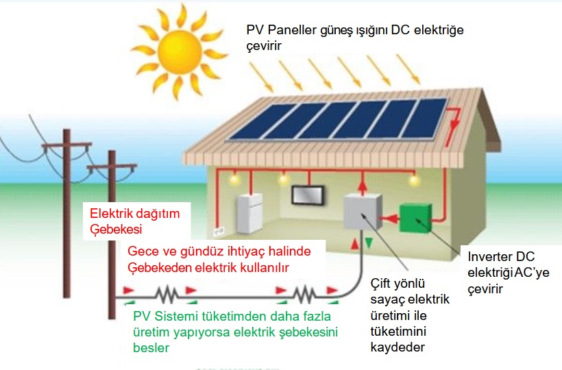 PV Paneller güneş ışığını DC elektriğe çevirir Inverter DC elektriği AC’ye çevirir Çift yönlü sayaç elektrik üretimi ile tüketimini kaydeder Elektrik dağıtım Ģebekesi Gece ve gündüz ihtiyaç halinde Ģebekeden elektrik kullanılır PV Sistemi tüketimden daha fazla üretim yapıyorsa elektrik şebekesini besler.