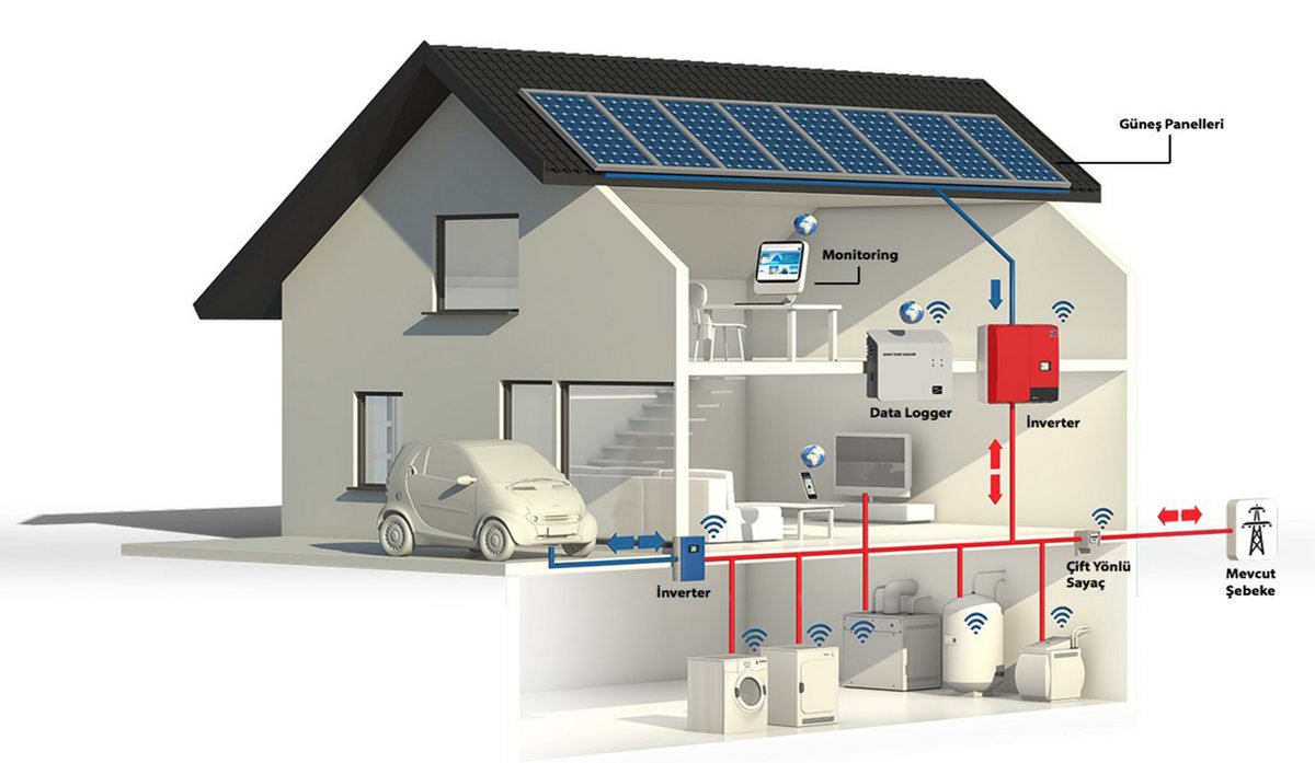 Bu sistem, güneş panelleri, inverter, elektrik sayaçları ve şebeke bağlantısı ile çalışır: